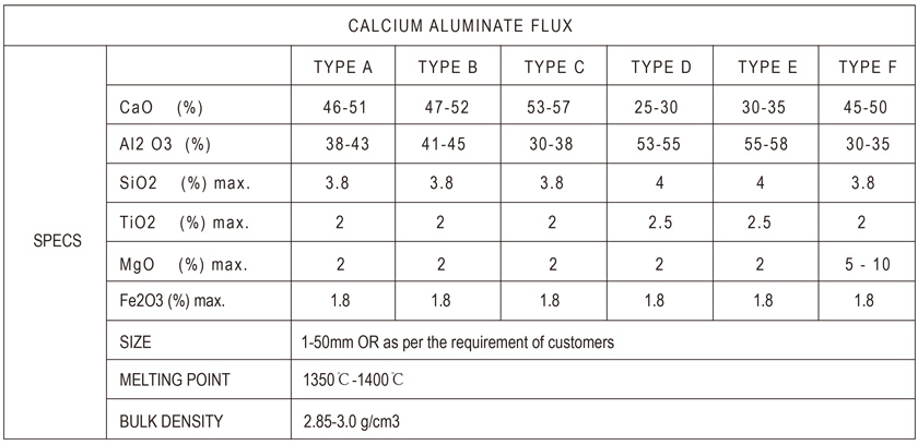 - Calcium Aluminate contains no fluorine compounds, thus avoiding refractory attack and atmospheric pollution. Calcium Aluminate is the best substitute for Calcium Fluoride.